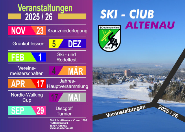 Hiermit laden wir unsere Mitglieder, Freunde und Förderer zur Jahreshauptversammlung 2025 des Ski-Club Altenau e.V. von 1898 am Freitag, 11.April 2025 um 19:00 Uhr im Landhotel „Alte Aue“ (Marktstr. 17, 38707 Altenau) recht herzlich ein. Tagesordnung Anträge zu Punkt 12 der Tagesordnung müssen bis spätestens 08. April 2025 beim Vorsitzenden, Henner Riese, Karl-Reinecke-Weg 25, 38707 […]